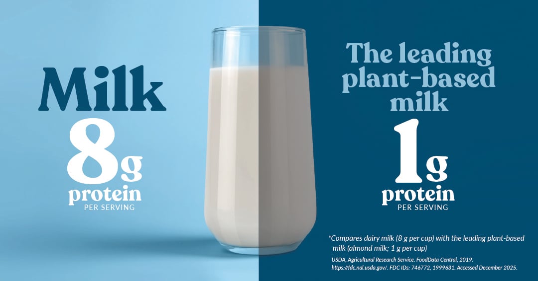 Not all protein is created equal. Milk naturally provides complete, high-quality protein with all nine essential amino acids your body needs to build muscle, support recovery, and stay energized. Milk has 8 times more protein per serving than the leading plant-based alternative.